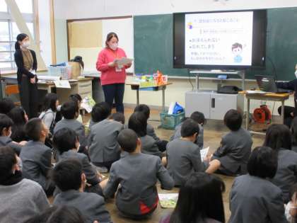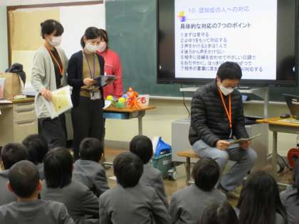 市役所のいきいき健康課から5名の方に来ていただき、認知症について教えてもらいました。また、町で認知症の方に出会った時には、どうしたらよいか具体的に実演を交えて分かりやすく教えていただきました。