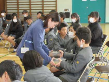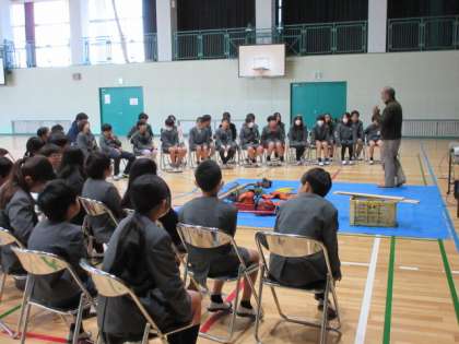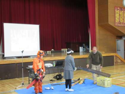 今日は、高野山森林組合から3名の方にきていただき、林業や森の役割について教えていただきました。林業で使う道具の紹介や体験をさせてもらいました。