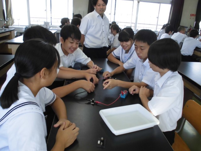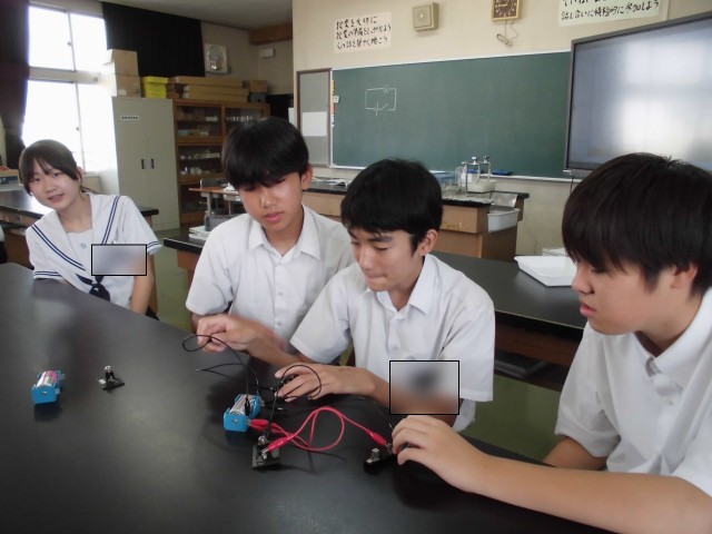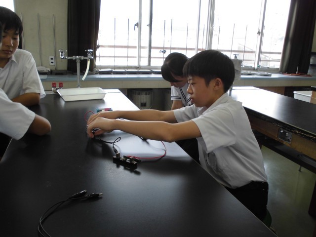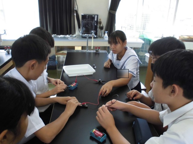 "階段の途中にある照明には切りかえ式スイッチが使われており、階段の上のスイッチでも下のスイッチでも、つけたり消したりできる。階段の照明はどのような回路なのだろうか。” グループで一生懸命考えていました。授業で学んだことが身の回りに潜んでいることに気付くことができましたね。