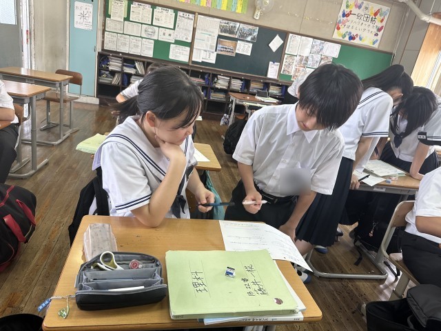 B組は理科の授業で、濃度の計算について、生徒同士で教え合いながら学んでいました。