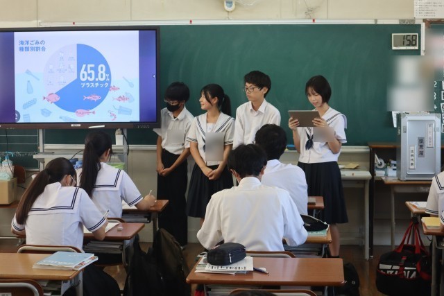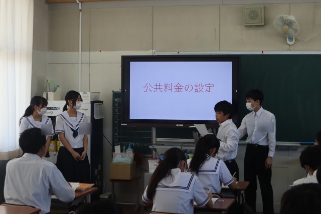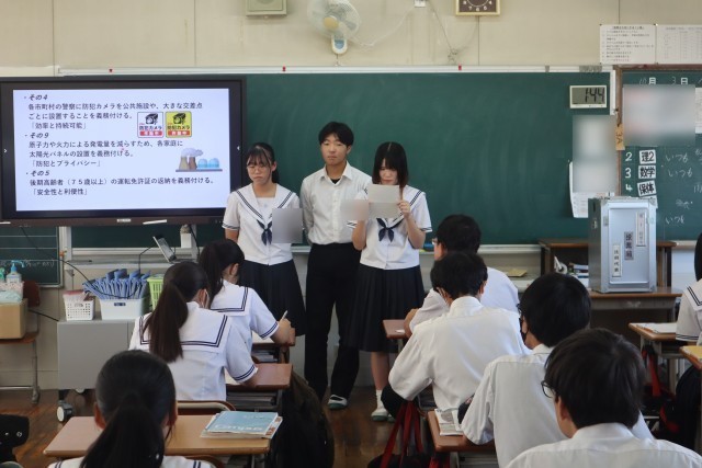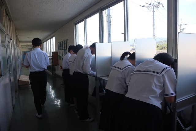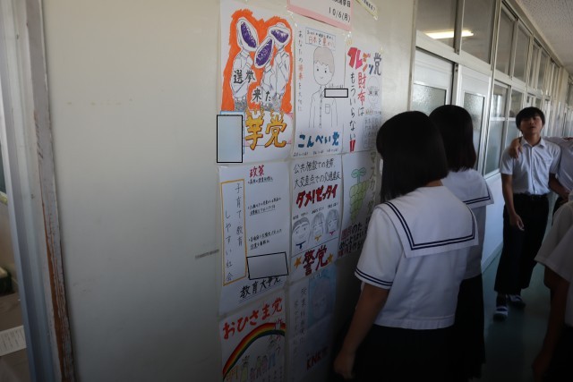 橋本市から記載台と投票箱をお借りして模擬選挙を行いました。3時間の授業で政策を考え、政策一致した同士で政党を作ったり、ポスターや演説を考えたりしました。3年後は有権者として、大事な一票を投じてほしいです。