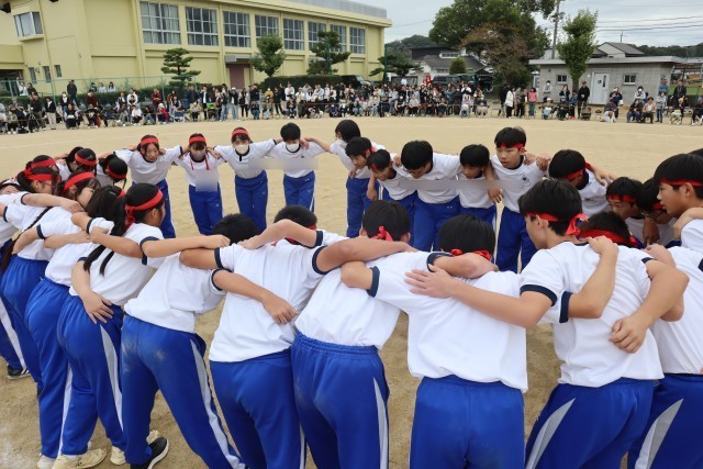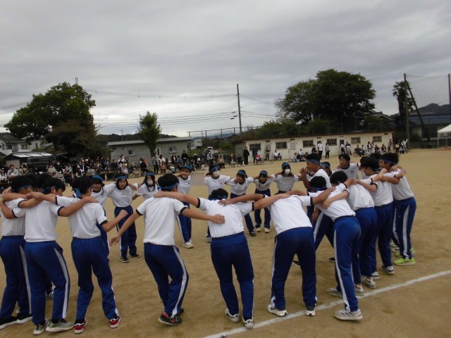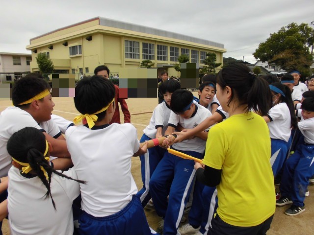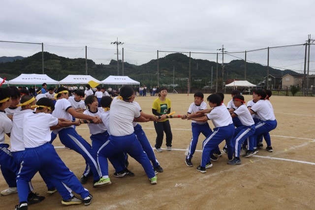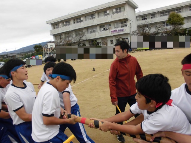 この種目は2年生全員で行われる棒引きです。各組で複数回試合をし、とった棒の合計得点で勝敗を競い合いました。棒ごとに得点が違うので、高得点の棒を狙ったり、本数を多くとりにいったりなどの各組の作戦が光る競技になりました。