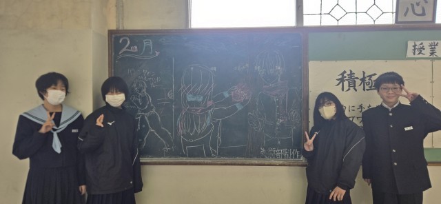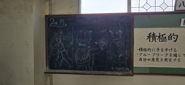 ハートを渡す瞬間の緊張感や照れた表情を、チョークの色彩で表現しています。