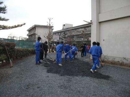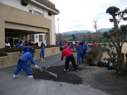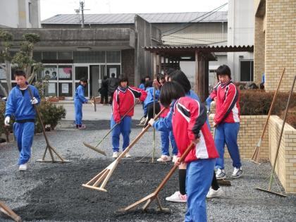 明日は卒業式です。 卒業式予行の後、校門周辺・体育館前・生徒玄関前・職員玄関前を、野球部、男子ソフトテニス部・バレー部・ソフト部・バスケット部のみんなさんできれいに整地してくれました。 大変きれいになりました。ご苦労様でした。