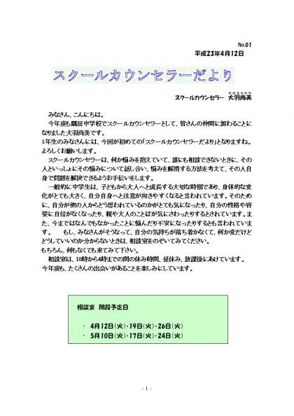 隅田中学校 4月15日(金) スクールカウンセラーだより