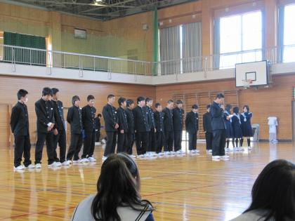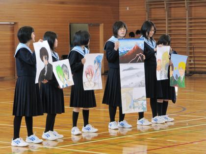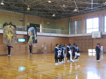美術部・パソコン部の発表です。美術部は大きなモザイク画を見せてくれました。