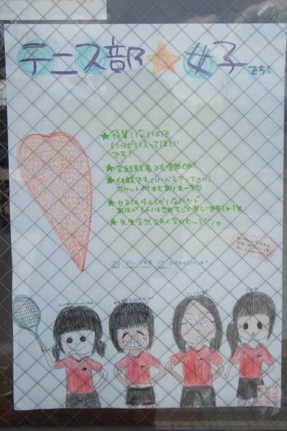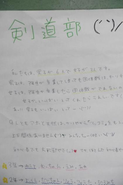 先日体育館でクラブ紹介を行いその後クラブ登録をしました。一旦入部届けを提出し、しばらく移行期間としています。生徒玄関や校舎の掲示板にクラブの募集ポスターを貼っています。その一部です。