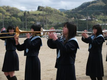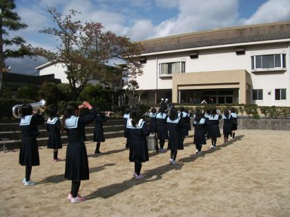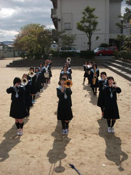 写真は外でマーチングの練習をしている吹奏楽部です。