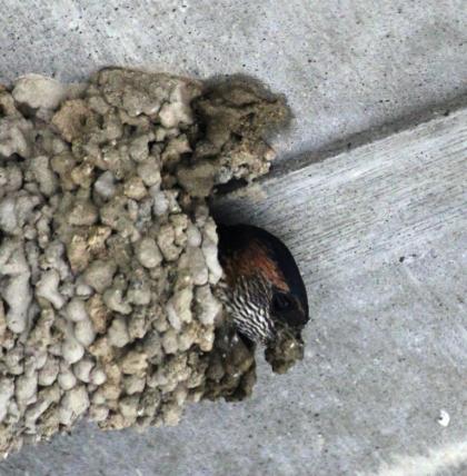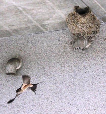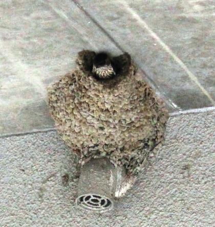 家庭科室前の軒下で、2羽の野鳥が換気口の上に巣を作っています。