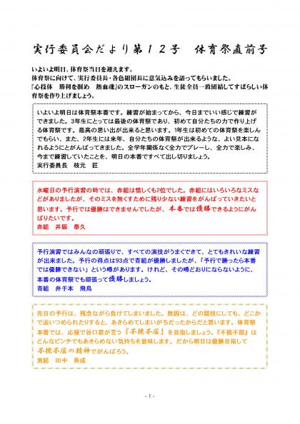 【生徒全員一致団結してすばらしい体育祭を作り上げましょう。】