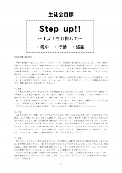 そこで今年から1段階レベルアップし、集中、行動、感謝の3つの柱を中心に自分たち一人一人の意識を向上するため、新たな目標を立てました。それが「Step up!!〜一歩上を目指して〜」です。この目標のようにみんなで一歩踏み出せるようにがんばっていきましょう。