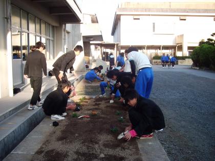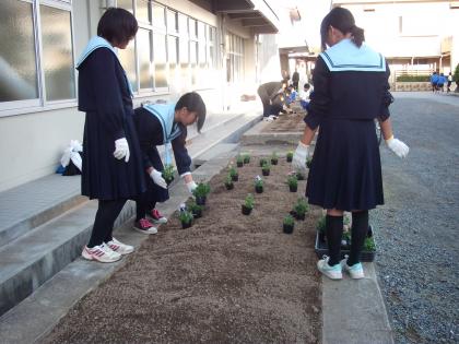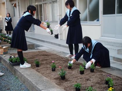 11月8日(火)、放課後、園芸部員で教室横花壇に花を植えました。4つの花壇をそれぞれの班に分かれ、アイデアを出し合いコーディネートして完成しました。これから花が咲くのが楽しみです。