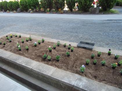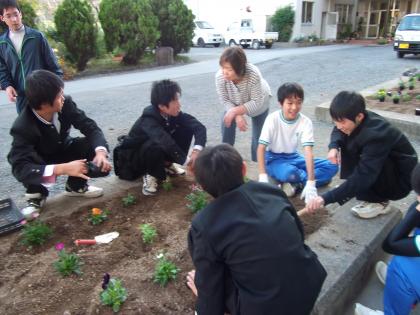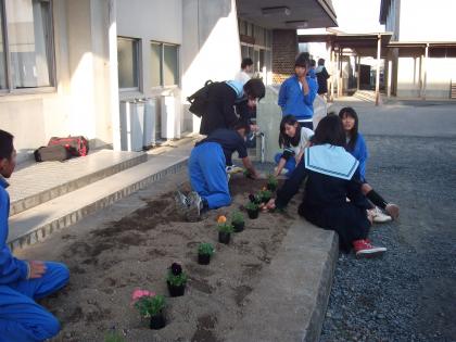 放課後、園芸部員で教室横花壇に花を植えました。みんな協力して短時間できれいな花壇ができました。