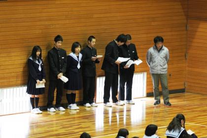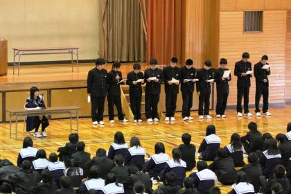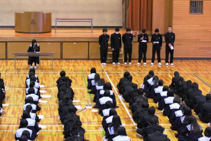 その話し合いを基にまとめた内容を、修了式後の生徒総会で各学級と委員会の代表が報告しました。来年の専門委員会の活動では、今回の反省をしっかり引き継いで、さらにすばらしい生徒会活動ができるよう頑張ろう。