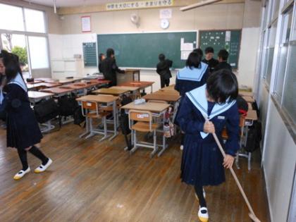 教室、ローカ、トイレ、生徒玄関などを掃除しています。