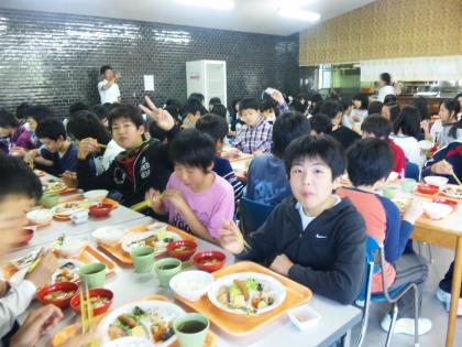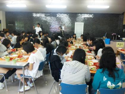 1年宿泊研修5月17日 朝食 みんな元気に朝食を食べています