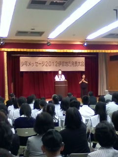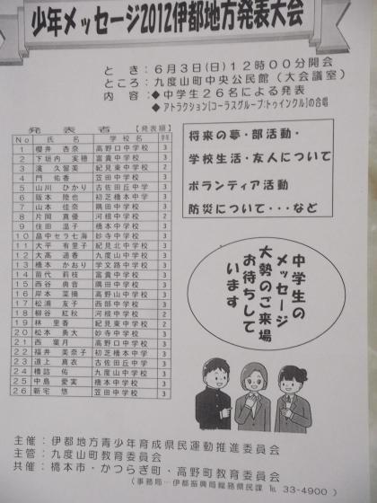 少年のメッセージ伊都大会が九度山の中央公民館で開催されました。山本佳奈さん(地域活動を通して)と西谷典音(私が今 思っていること)さんが隅田中学校を代表して発表してくれました。