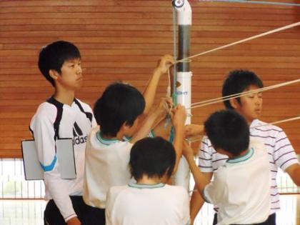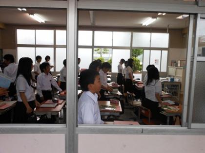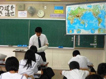 1年生の授業風景 4 公開日 2012/06/08 更新日 2012/06/08 1学年 3時限目、1Aは社会で教育実習生の寺本先生の授業です。1Bは英語、起立をしています。今から始めます。1cは体育です。バレーボールの準備を教育実習生の森本先生と土井先生と生徒が協力して行っています。