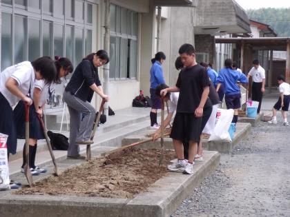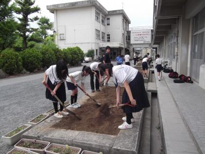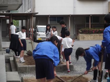 6月11日(月)放課後、各学年の園芸委員で教室横の花壇に夏の花を植える準備(花壇を耕し・石灰をまき・肥料をまぜる)をしているところです。