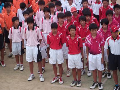 ソフトテニス 夏季中体連 その1 公開日 2012/07/14 更新日 2012/07/14 部活動 本日、橋本運動公園テニスコートにおいて、夏季中体連ソフトテニスの部団体戦が行われました。 開会式では、本校男子キャプテンの田中維珠舞君が堂々と選手宣誓を行いました。