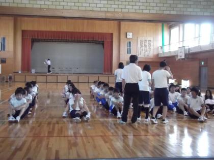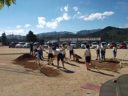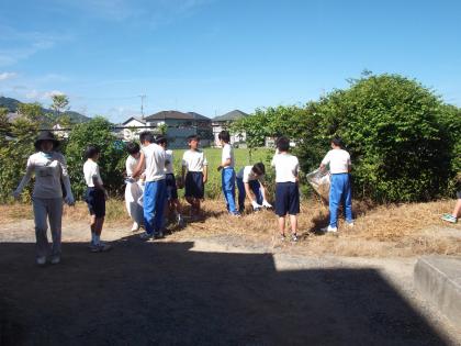 各学年分担して一斉に清掃活動をしています。(1年生は、校舎周辺の草集め・2年生は運動場整地・3年生は体育館)
