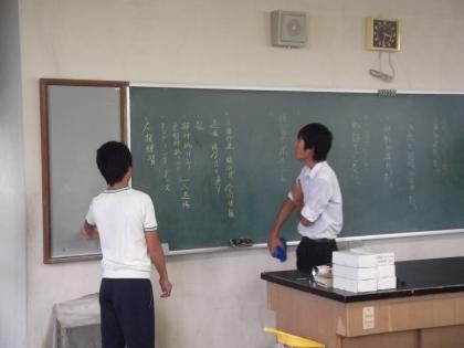 体育祭練習のあとの放課後、もう恒例となった体育祭実行委員会が理科室で開かれていました。生徒会執行部や団長・副団長をはじめ、各クラスの代表者が集まり、本日のよかったところや反省点、次回の練習の予定等について話し合っています。