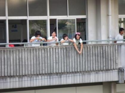 運動場の使用順を待つ間にベランダから見ている生徒も多くいました。