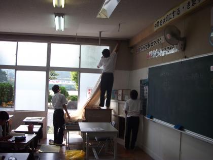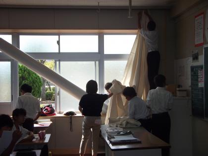 今日は、教室にカーテンをつけました。