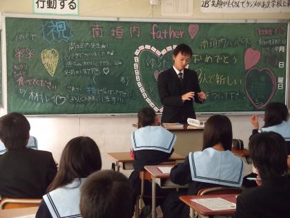2Bの生徒たちは黒板いっぱいにお祝いのメッセージを書いて朝の会を待っていました。