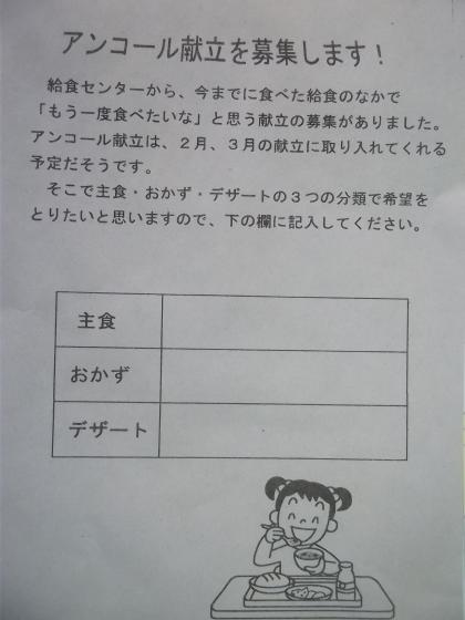 給食センターより 公開日 2013/01/09 更新日 2013/01/09 隅田中日記 給食センターよりアンコール献立ということで「もう一度食べたい」と思う献立の募集がありました。さて どのようなメニューが人気になるのでしょうか?
