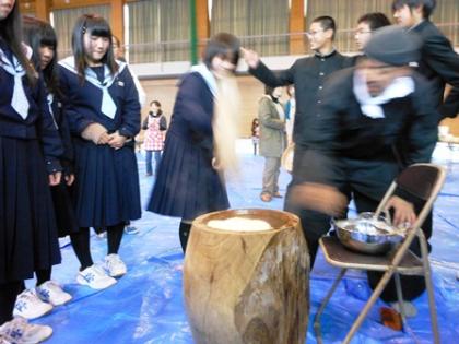 生徒会、PTA、学校生徒みなさんのご協力のもと、餅つきを行っています。最初は3年生から餅をついています。