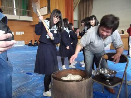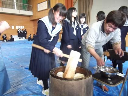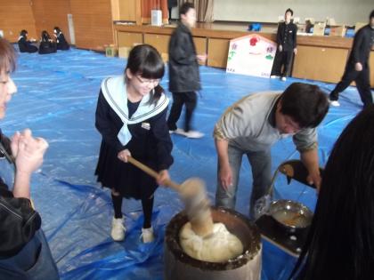 新年の集い 1年生 公開日 2013/01/15 更新日 2013/01/15 1学年 1年生は初めての経験です。 杵を力強く振り落とすことが大変そうでしたが、 その後、自分たちでついたモチをおいしそうに食べていました。