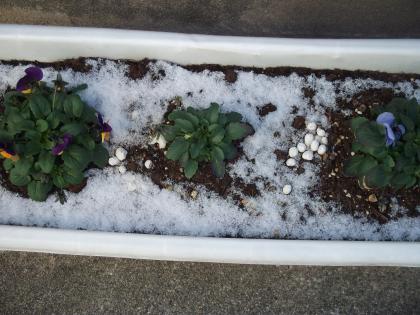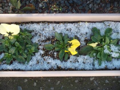 今日のあさ、運動場もプランター薄すら雪化粧でした。