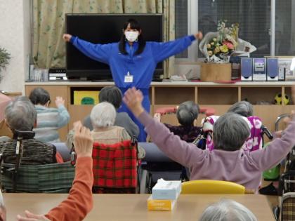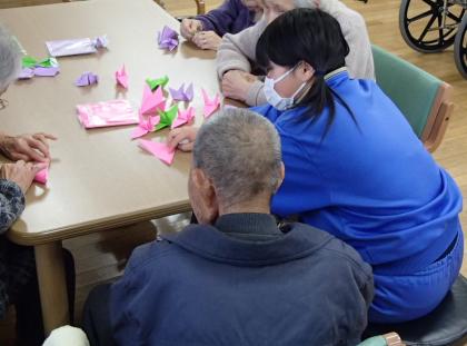 2年職場体験2日目ひかり苑です。お年寄りの皆さんと折り紙をしたり、体操やゲームをしました。