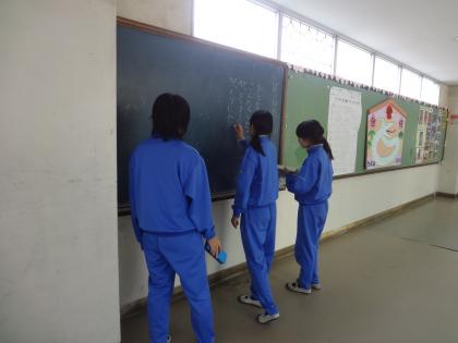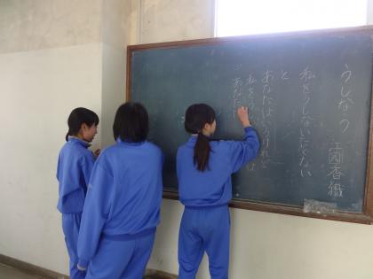 女子は、生徒玄関の黒板へ詩の書き換えを行いました。