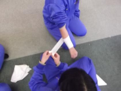 また、包帯や三角巾の使い方を2人ペアで実践しました。