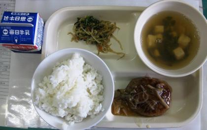 今日の献立は 《ごはん・牛乳・わふうきのこハンバーグ・ナムル・すましじる》 でした。