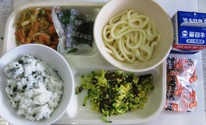 今日の献立は《げんりょうわかめごはん・牛乳・ひやしうどん・かきあげ・まめつぶころころ》でした。