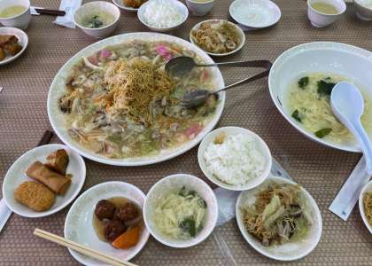 肉団子、春巻き、皿うどん、そして、大学いもの長崎中華フルコース!