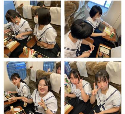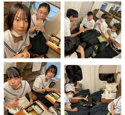 お腹を満たして、寝たり、遊んだりして、長い新幹線の時間が過ぎ、現在バスでガイドさんのお話を聞いています。2号車では、3年生はまじめで、かしこい!と必死にアピール。ファイト!