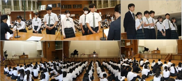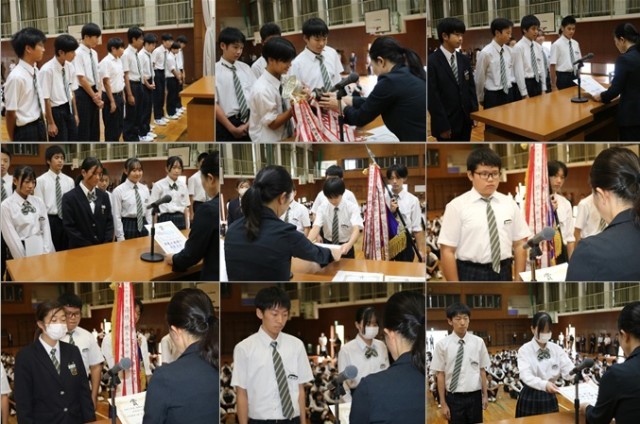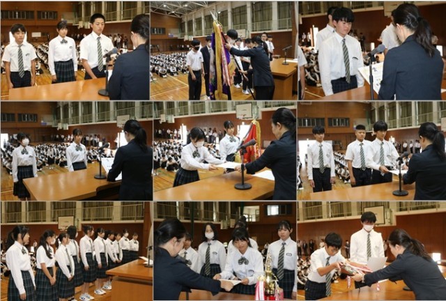 10月10日(金)、1学期終業式が行われました。終業式に先立って表彰伝達があり、秋季新人大会の表彰などが行われました。その後、前期生徒会の退任のあいさつがありました。終業式では学校長から「紀見東の方程式」についての話などがありました。