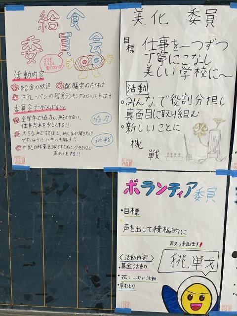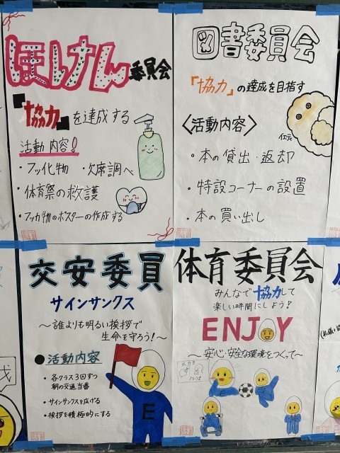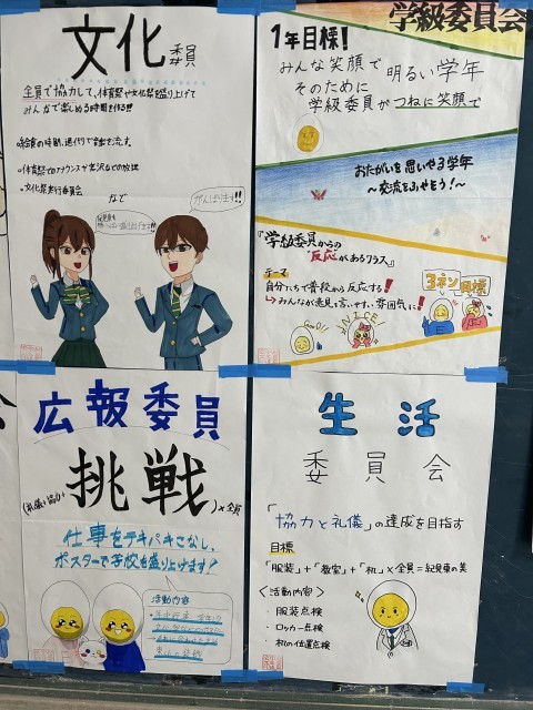 専門委員会では、生徒目標「紀見東の方程式 紀見東=礼儀+協力+挑戦×全員」の達成に向けて何ができるかを話し合い、各委員会で活動内容や頑張りたいことを掲載したポスターを作成しました。ポスターは部活動黒板前に掲示しています。