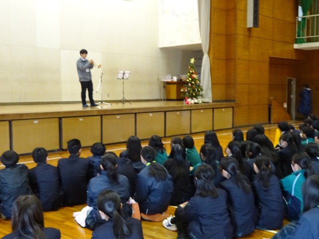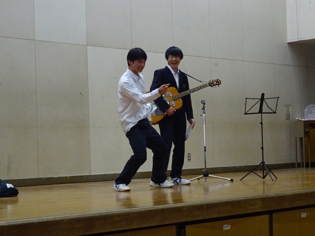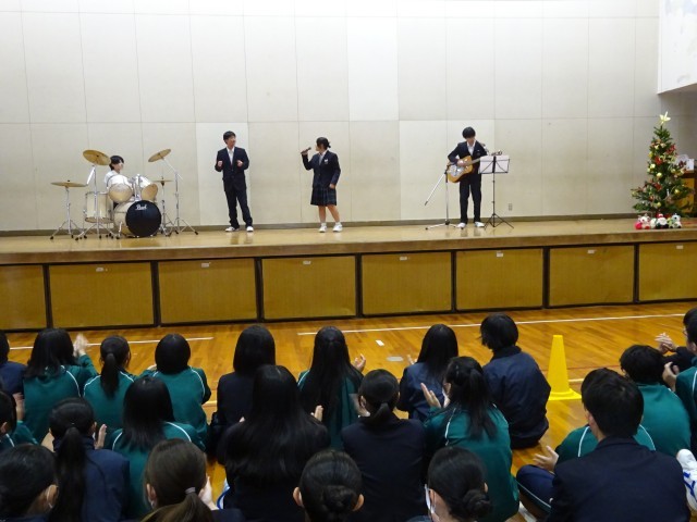 その後、先生によるトランペットの演奏「ジングルベル」に続き、生徒たちによる、たくさんの有志発表が行われました。内容は、ドラムやギターを交えたバンド発表、歌唱発表、ダンス発表、お笑いコントを見せてくれました。