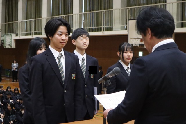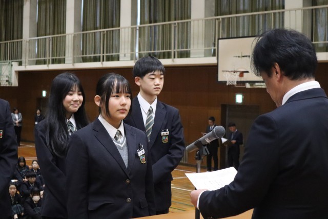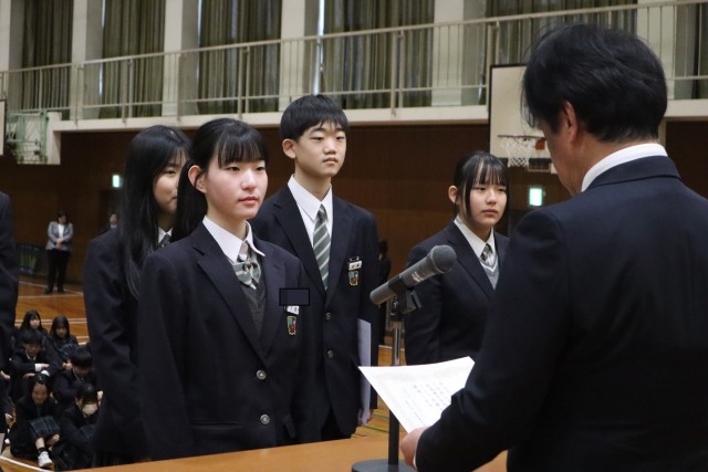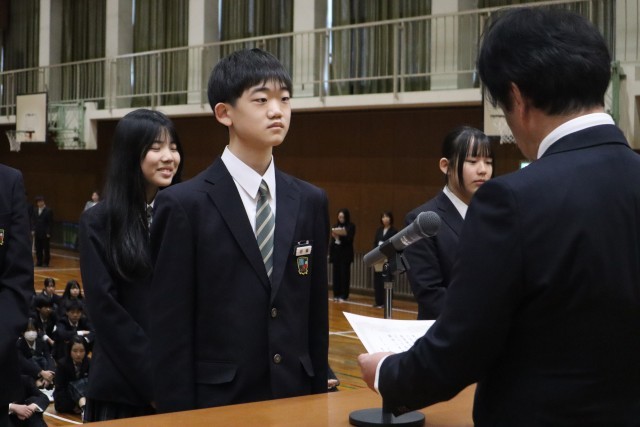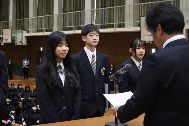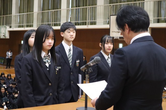 4月8日(水)、令和8年度の新任式と始業式がありました。新任式では新たに12名の先生方を迎えることができ、代表として松下先生からあいさつがありました。始業式ではまず学校長から式辞があり、2年生・3年生は真剣な眼差しで話を聞いていました。前期生徒会の任命式では、新たに6名の役員が任命されました。最後に、2年生と3年生の担任と教科担当、部活動顧問の発表がありました。