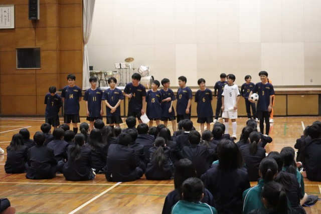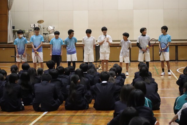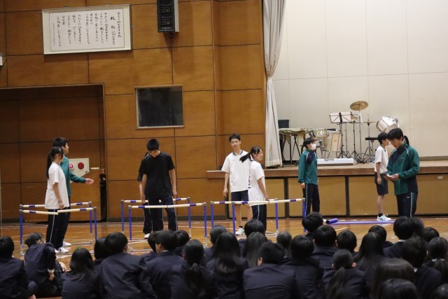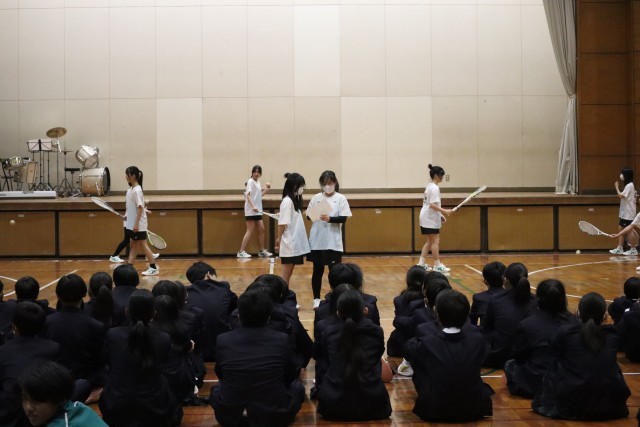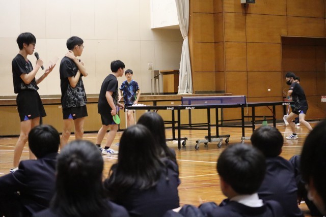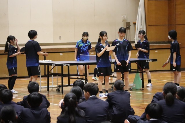 4月10日(金)、本校体育館にて部紹介が行われました。それぞれの部で、工夫を凝らしたユーモアあふれるパフォーマンスや紹介がされました。1年生のみなさんは、どの部にするかよく考えて、入部するクラブを決めてください。
