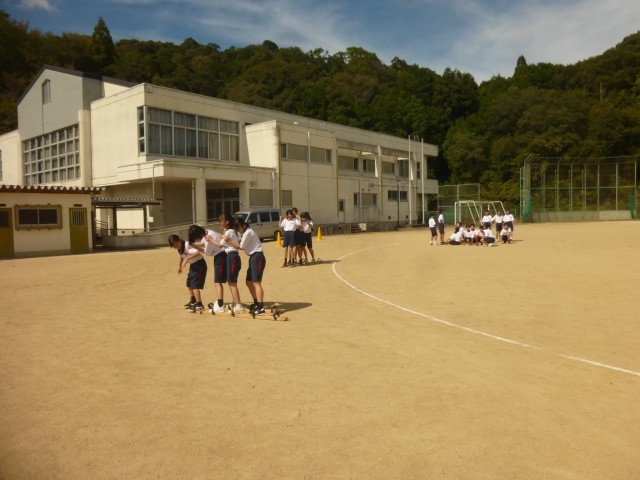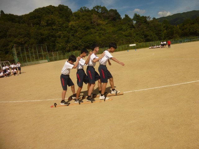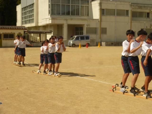 本日、1年生は体育祭の学年練習でムカデ競争の練習をしました。初めての練習で、なかなか前に進まず苦戦する組もありましたが、「右、左、右、左」と声をかけながら徐々にスピードアップできるようになってきました。