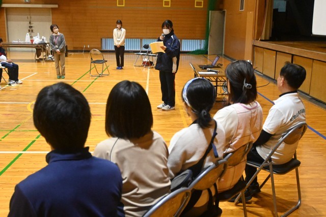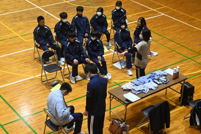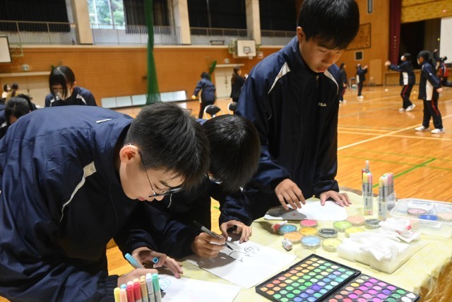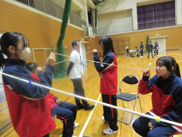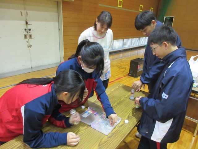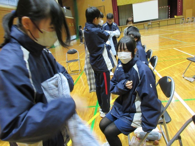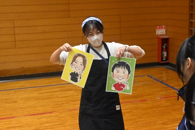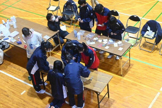 柔道整復師の岸田さん、保育教諭の中澤さん、介護福祉士の柳瀬さんと小林さん、イラストレーターの寶満さんを講師としてお招きし、体育館に設けたそれぞれのブースをめぐって体験学習をしました。