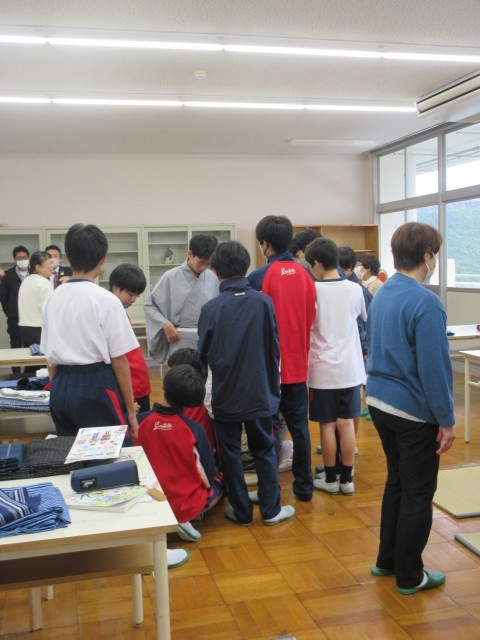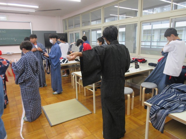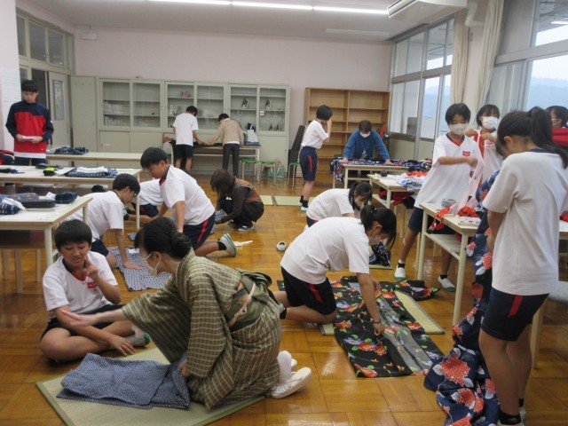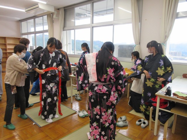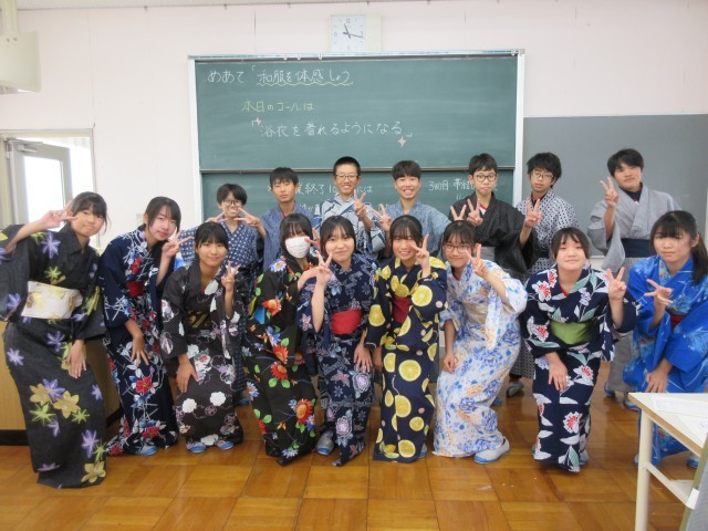 家庭科で行っていた「着付け」授業の様子です。お祭りなどで着る人もいるかもしれませんが、なかなか着る機会が少なくなっている着物を着付けの先生やボランティアの方々に丁寧に教えていただきながら着ることができました。ご指導のおかげで生徒たちはとても楽しく授業に臨むことができました。ありがとうございました!