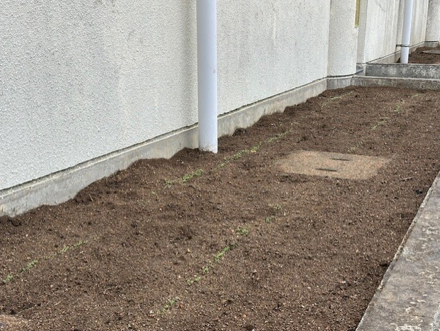 先日PTA環境整備作業として斜面に防草シートを張ったり、花壇に種を植える作業などをお手伝いいただきましたが、体育館横の花壇には小さな芽が育ってきています。