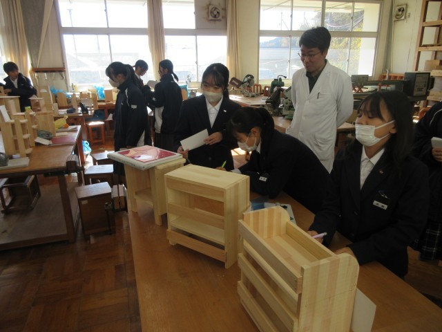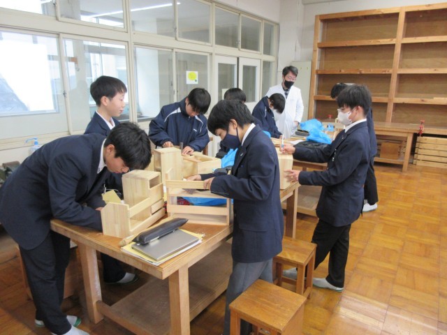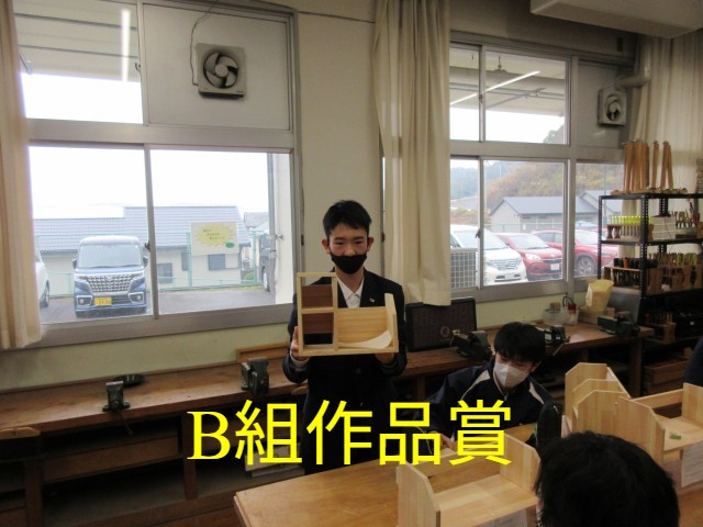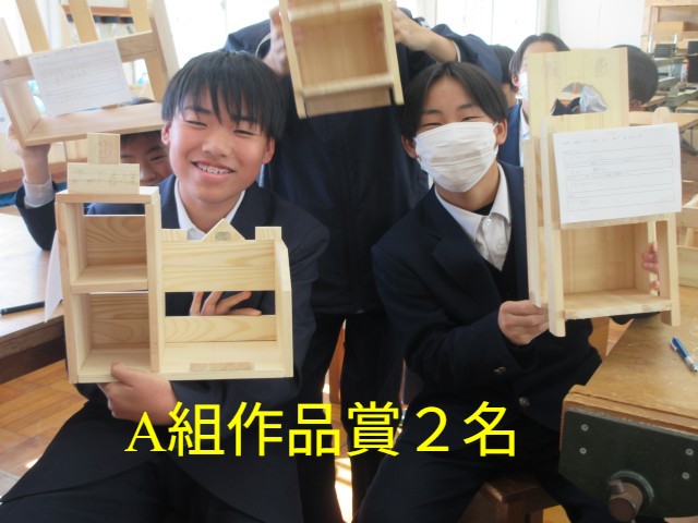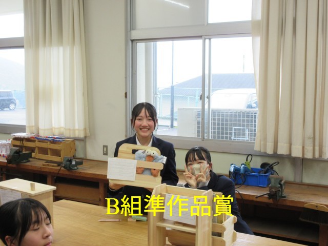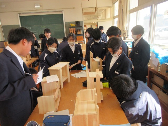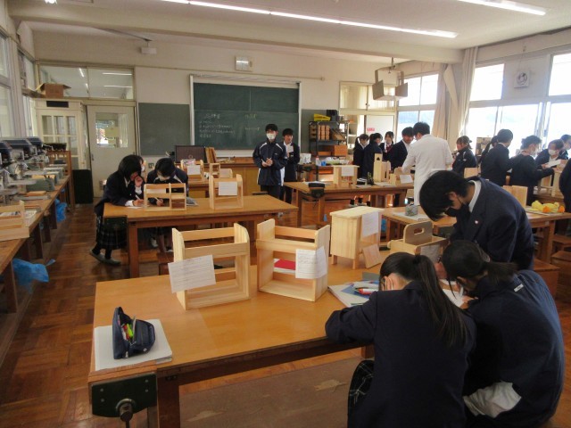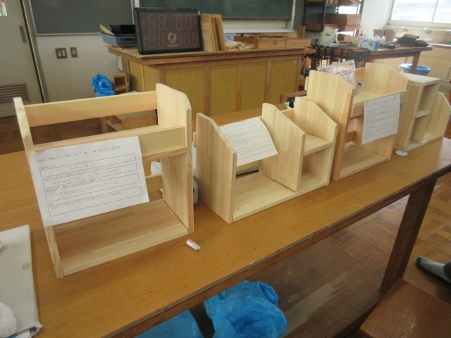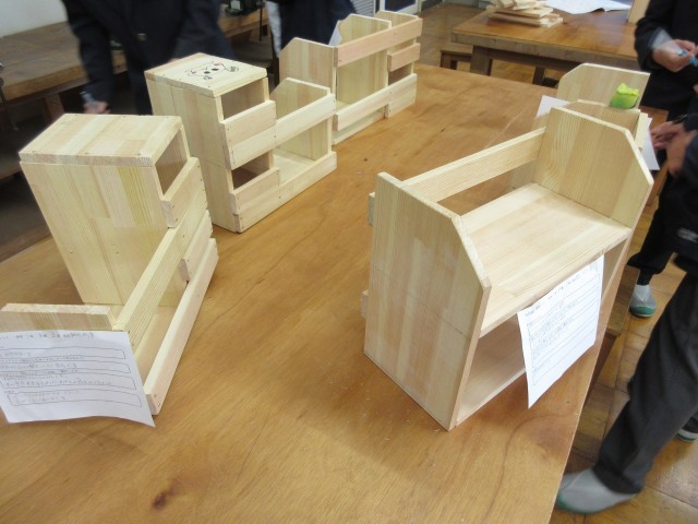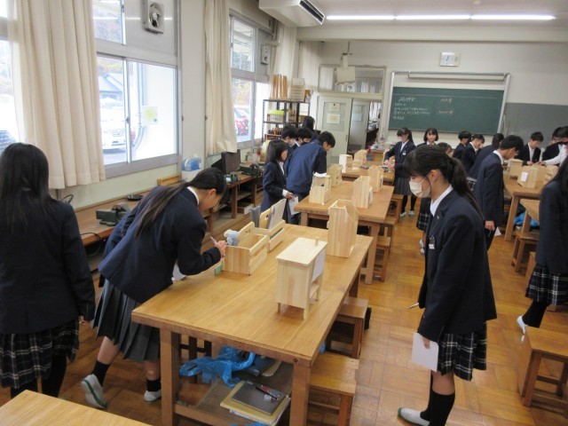 技術の授業で制作に取り組んでいた木工作品が完成し、各クラスで品評会を行いました。生徒たちはそれぞれに作品のタイトルやキャッチコピーなどを考え、作品に貼り付けたうえで友達に見てもらいました。品評会ではクラスの作品の中から最もよかったと思う作品賞、キャッチコピー賞を1人ずつ選んで投票し、最後には結果が発表されました。みんなドキドキしながら開票を見守り、選ばれた友達を拍手で称えていました。慣れない手つきで苦労しながら出来上がった作品ですので、ぜひ家で大切に使ってくださいね。